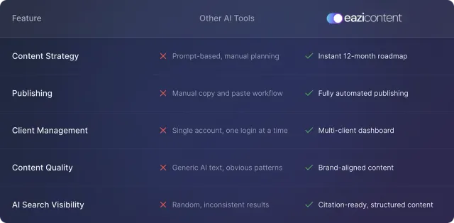 With Eazi-Content, your clients get weekly, SEO-optimised content automatically – and you get predictable delivery without having to hire writers or manage any content production.
